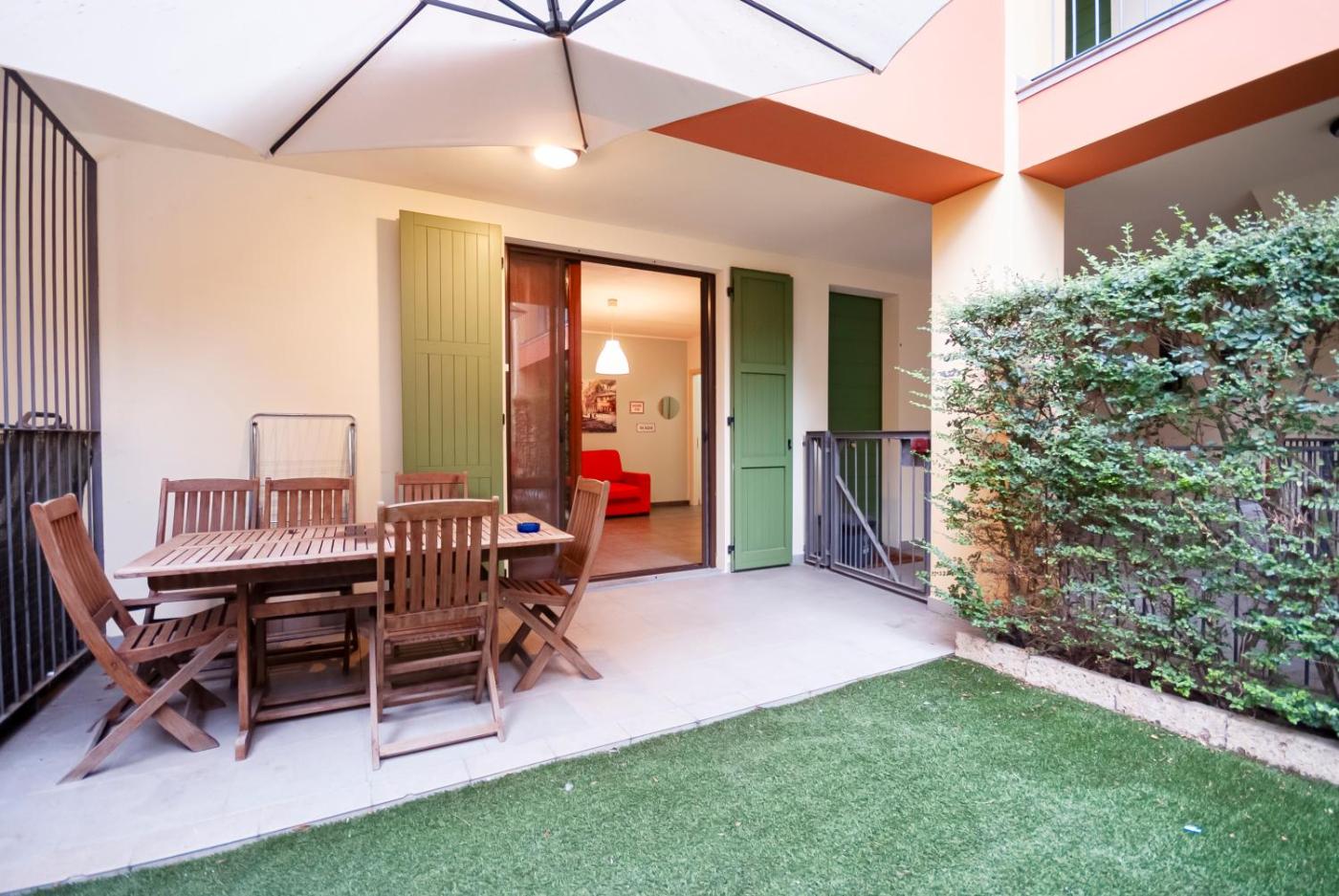 Questo appartamento comprende 1 camera da letto, 1 bagno, lenzuola, asciugamani, una TV a schermo piatto, una zona pranzo, una cucina con utensili e una terrazza con vista sul giardino.