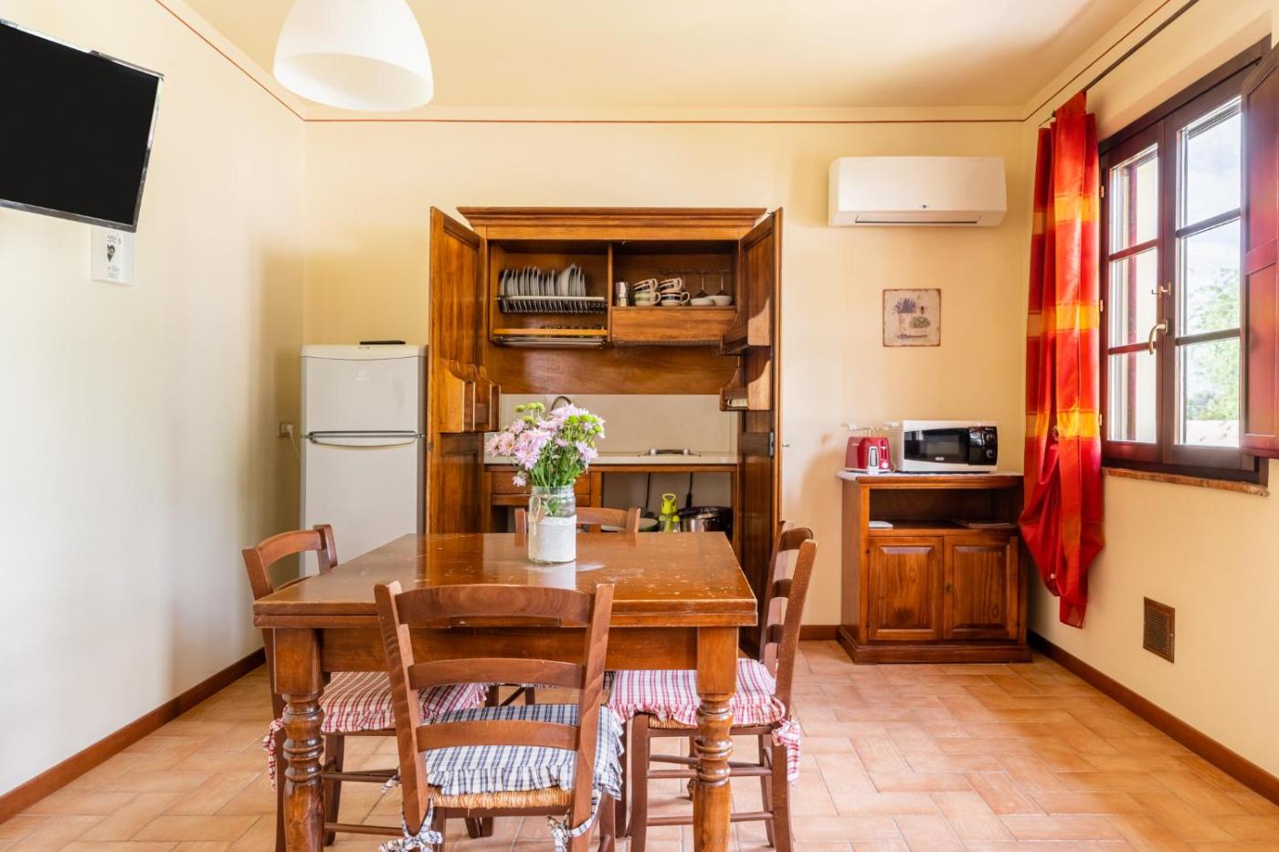 Questo agriturismo con aria condizionata comprende 1 camera da letto, un soggiorno, una cucina con utensili, microonde e macchina da caffè, e 1 bagno con doccia edi cortesia. Presso questo agriturismo troverete asciugamani e lenzuola a disposizione.