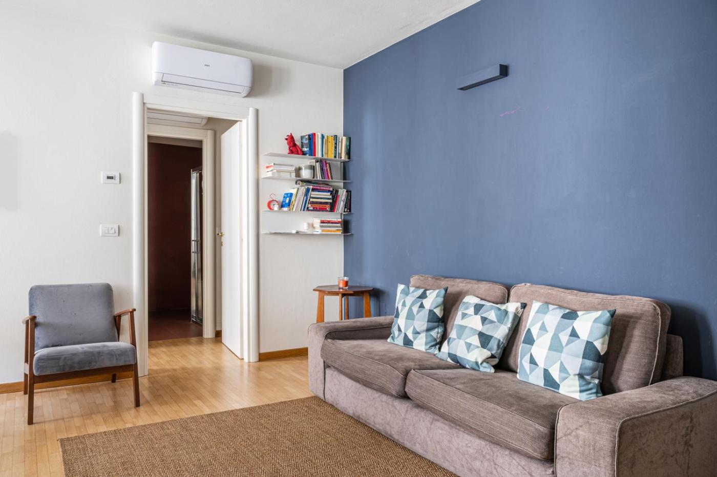 Appartamento con 1 Camera da Letto. This air-conditioned apartment comprises 1 living room, 1 separate bedroom and 1 bathroom with a shower. Guests can make meals in the kitchen that comes with a stovetop, a refrigerator, a dishwasher and kitchenware. The apartment provides a washing machine, a coffee machine, a seating area, a dining area and a flat-screen TV with satellite channels. The unit offers 1 bed.